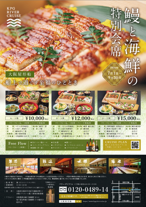 2026.04.23 <2026/7/1〜9/30> 鰻と海鮮の特別会席を開始いたします いつもKPG RIVER CRUISEをご利用いただきありがとうございます。 7/1より鰻と海鮮の特別会席のご提供を開始いたします。 お集まりにぜひご利用くださいませ。 <期間>2026年7月1日(水)〜9月30日(水)